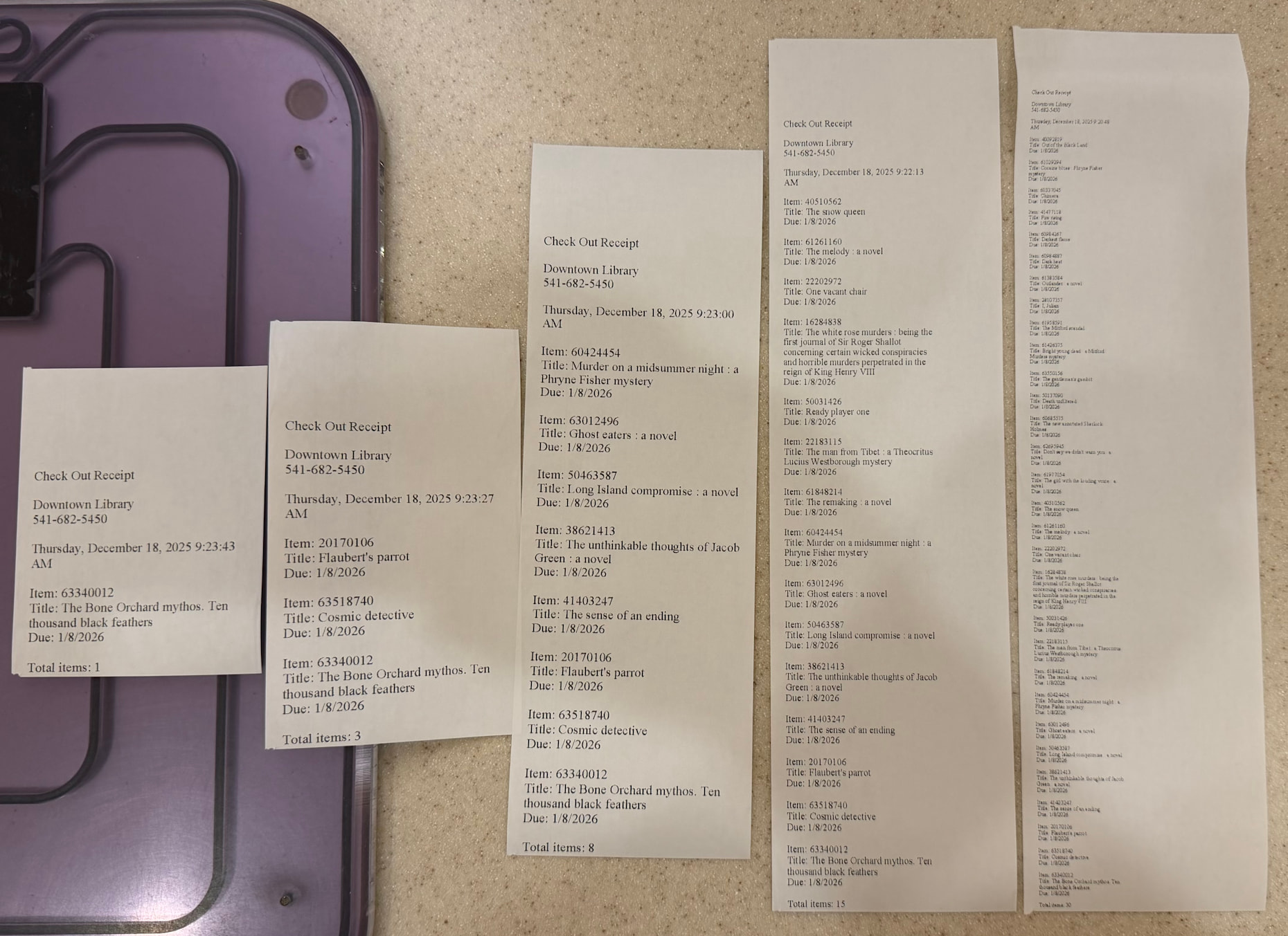 Had a complaint from a patron passed to us through a front desk worked that the receipt they got from the ExpressCheck was unreadable. Got a look at it and indeed each block of text from each item was about the size of my little fingernail with unreadable 2pt text. Tested myself and got the same thing. It basically scaled down with the number of items.