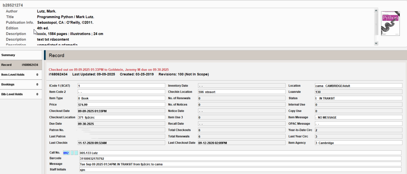 Essentially this makes it so the checkin in step 4 just doesn’t happen at all, BUT the item status and message are still triggered as if it had, producing here the Message “Tue Sep 09 2025 01:34PM IN TRANSIT from fp2circ to cama”